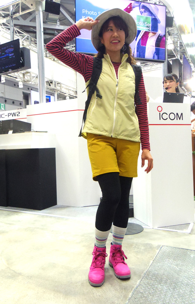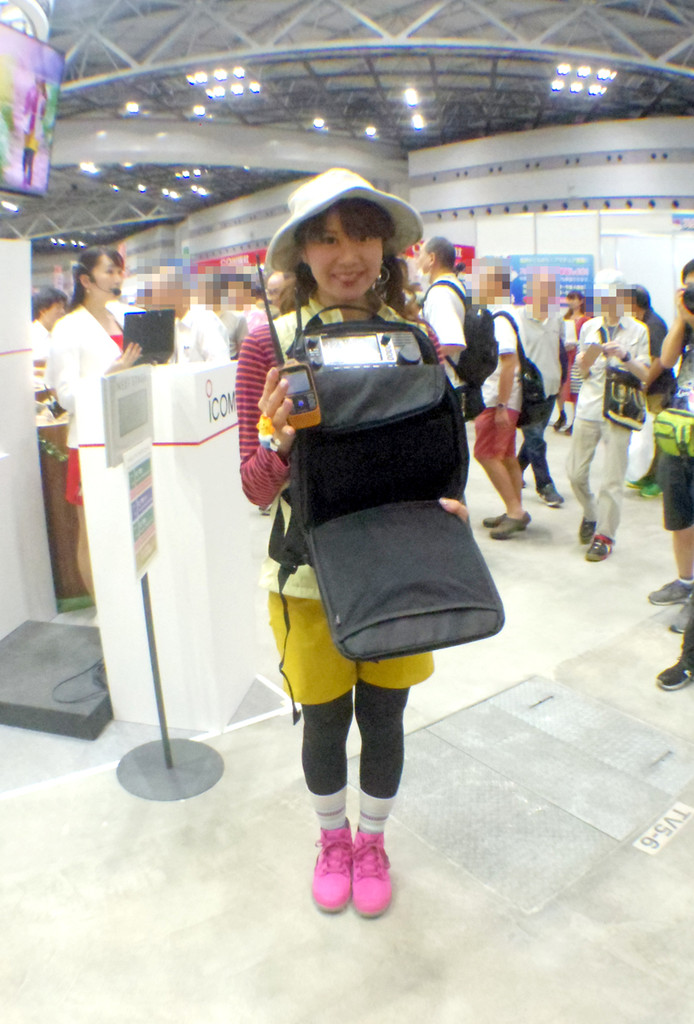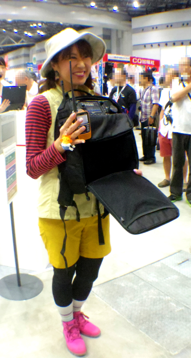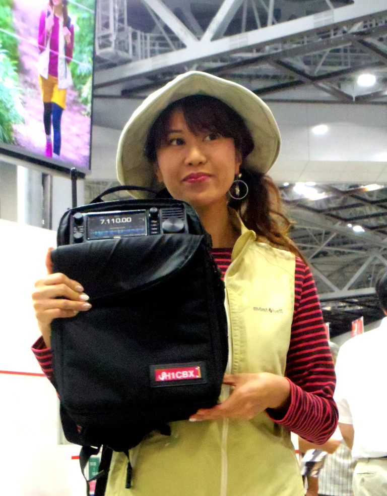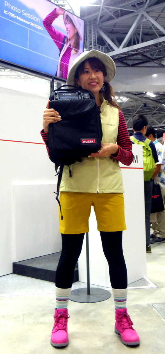 カタログにも掲載されたマルチバックを背負ったモデルMasacoさん(局免持ち、JARL広報大使でもある)が登場し、ポーズをとる。