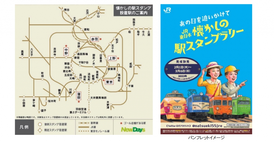 「2022年2月1日(火)から3月6日(日)までの期間、「懐かしの駅スタンプラリー」を開催します。旅の記念に駅スタンプ収集を目的として、1980年に全国約740の国鉄認定駅に設置された「わたしの旅」スタンプを「懐かしの駅スタンプ」として集めて楽しむ企画です。スタンプは期間限定で、JR東日本48駅と東京モノレール2駅の計50駅に設置されます。」