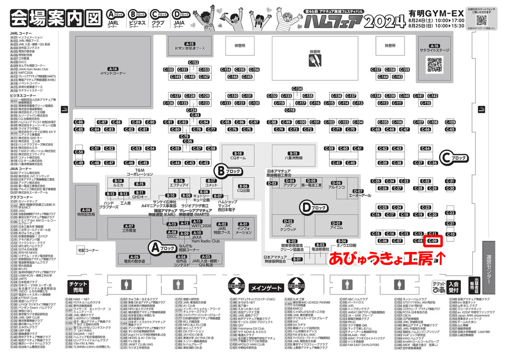 記念局エリアを後にし、本日ブース内で交信した8J1Z(C-50)、とJS1YQD(C-13)スペースに立ち寄り、カードをダイレクトでお渡しする。