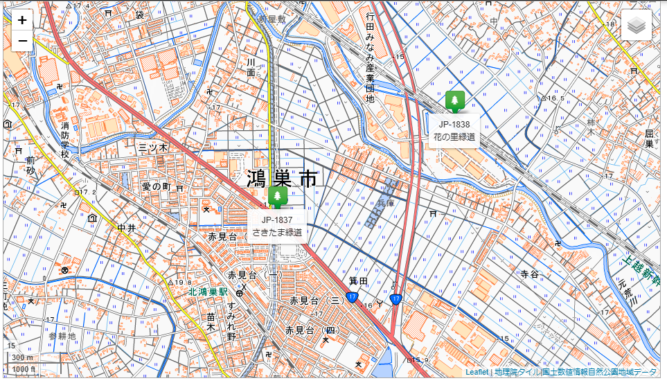 更に北鴻巣駅徒歩圏内のさきたま緑道(JP-1837)と花の里緑道(JP-1838)