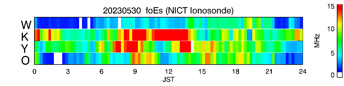 この時間帯のNICTの観測による国分寺上空のEs層臨界周波数の最大値は1145JSTの14.9MHz(継続時間1時間45分)。