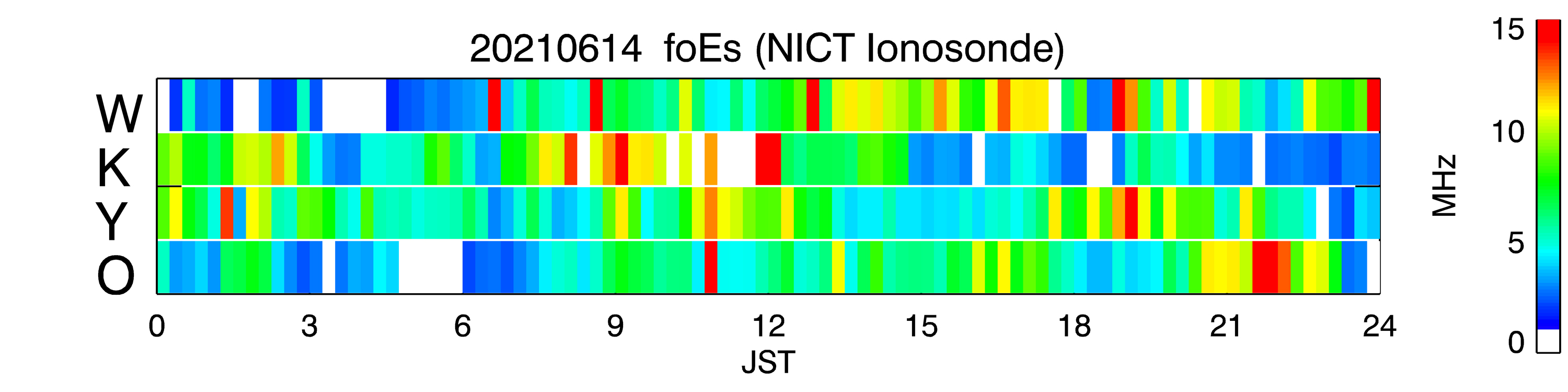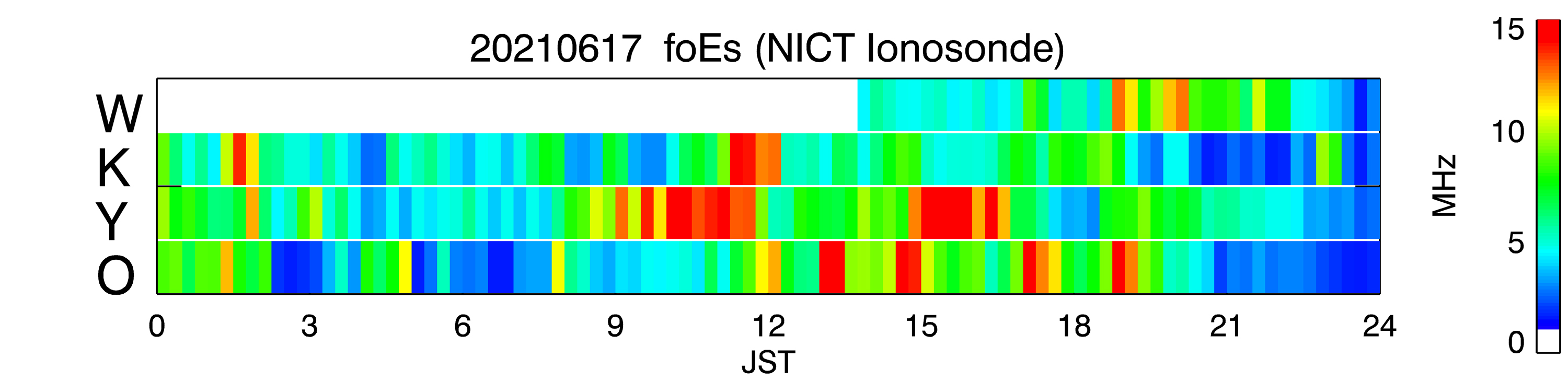 〇NICT による6月17日 foEs の観測(稚内W、国分寺K、山川Y、沖縄O)